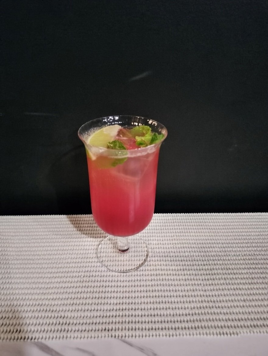 Place all ingredients in a shaker. Shake with ice for 10 seconds. Double strain into a hurricane glass or highball glass. Add ice and top up with soda water. Garnish with a slice of lime and mint leaves.